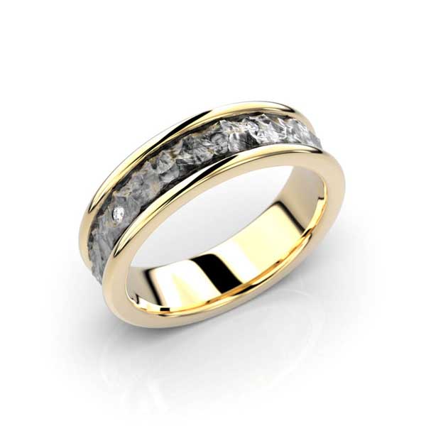 Festive Peruskallio sormuksessa yhdistyy luonnon karkeus ja rosoisuus sekä pehmeä pyöreä muoto. Tämä näyttävä sormus on valmistettu keltakullasta, kullan pitoisuuden voit valita kolmesta eri vaihtoehdosta 9k, 14k tai 18k. Sormuksen musta keskiosa on toteutettu rodinointi-pinnoitteella. Sormuksen runko on melko leveä, mitaltaan 5,5 mm, joten on suositeltavaa valita normaalia sormuskokoaan puoli numeroa suurempi koko, jotta voidaan taata sopiva istuvuus. Sormuksen mustaan keskiosaan on istutettu viisi kappaletta 0,01 ct briljanttihiontaisia timantteja. Sormusta on saatavilla niin valko- kuin punakultaisenakin. Tästä sormusmallista on saatavilla myös kivetön versio, sormusperhe sopii hyvin pariskunnalle yhteiseksi kihlasormukseksi!