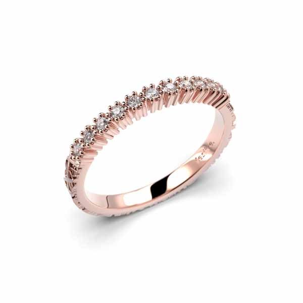 Punakultainen Festive Routa Tieva -rivisormus yhteensä 0,11 ct painoisilla timanteilla. Sormuksen rungossa on Routa-mallistosta tuttua kaunista kuviointia. Tämä siro rivitimanttisormus sopii erinomaisesti toisenkin sormuksen vierelle. Timantteja on rivissä yksitoista kappaletta. Sormuksen runko on leveydeltään 2,3 mm. Routa Tieva sormuksen punakullan pitoisuus on valittavissa 9 ja 14 karaatin väliltä.