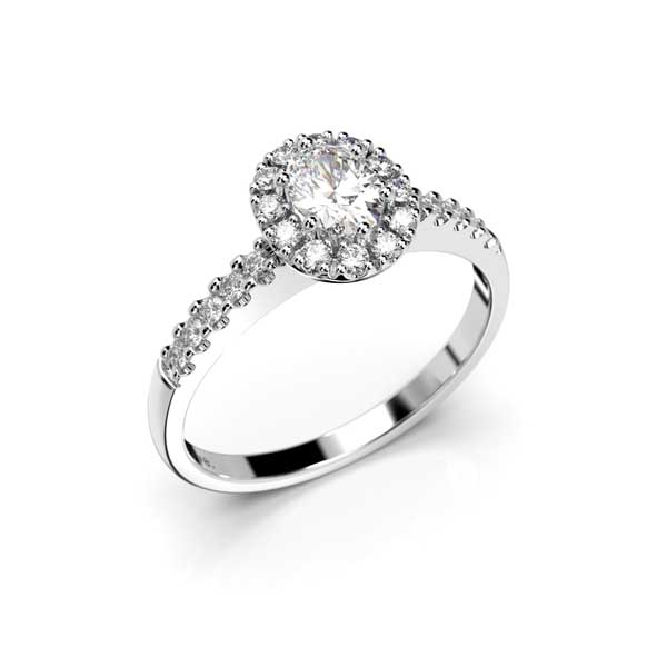 Hurmaava Festive Veronica-sormus jonka keskellä kaunis ovaalihiontainen timantti ympärillään säihkyvät briljanttihiotut timantit.