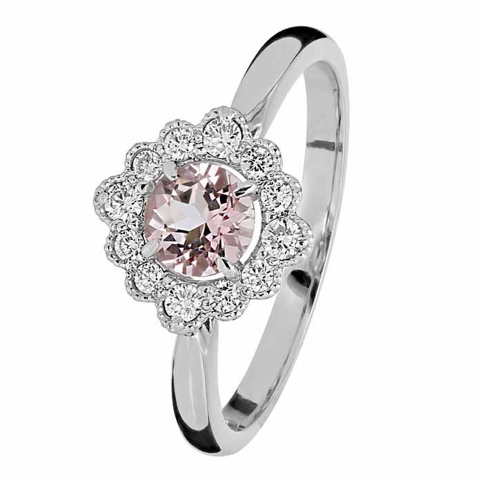Kotimainen Kohinoor Bellis halo-sormus pinkillä topaasilla. Tässä upeassa valkokultaisessa halo-sormuksessa kaunista vaaleanpunaista topaasia kehystää 12 kappaletta timantteja. Timantit on istutettu 5 mm kokoisen topaasin ympärille vinoneliön muotoon. Vinoneliön kulmissa on 4 kappaletta 0,02 ct painoista timanttia, muut 8 timanttia ovat 0,01 ct painoisia. Timanttisormuksen timanttien yhteispaino on 0,16 ct. Timanttisormus on valmistettu 14 karaatin valkokullasta ja sen siron rungon leveys on 1,9 mm. Tutustu myös muihin Bellis-tuoteperheen timanttikoruihin. Tämä värikivellinen sormus on saatavilla myös akvamariinilla, Kohinoor Bellis timanttisormus 033-616VA-16.