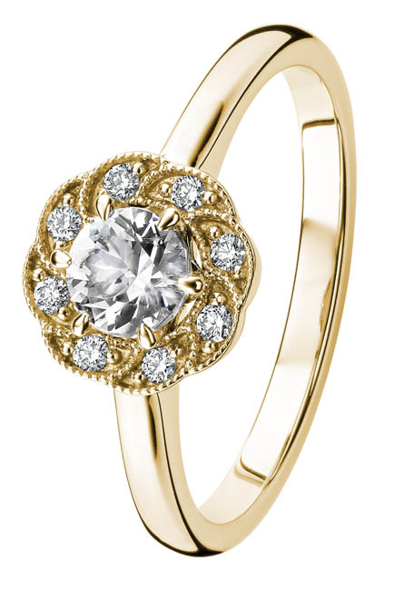Kotimainen Kohinoor timanttisormus. Sormuksen muotoilu on kauniin pitsimäinen ja herkän romanttinen Clara on upea sormessa. Sormuksen keskellä on pitsimäinen halo-istutus, jonka keskelle on istutettu 4,5 mm valkotopaasi. Topaasia kiertää kahdeksan 0,01 ct:n timanttia, joita ympäröi kaunis pitsimäinen krysanttireuna. Timanttien yhteispaino on 0,08 ct. Runko on valmistettu 14 karaatin keltakullasta. Tämä sormus on kaunis niin yksin kuin toisenkin sormuksen rinnalla. Saatavana myös valkokultaisena!