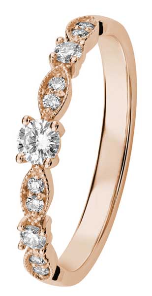 Kotimainen Kohinoor timanttisormus. Sormuksen muotoilu on kauniin pitsimäinen ja herkän romanttinen Clara on upea sormessa. Sormukseen on istutettu 11 timanttia, joita ympäröi kaunis pitsimäinen krysanttireunus. Sormukseen on istutettu yksi isompi timantti 0,09 ct keskelle runkoa ja sen molemmin puolin koristaa yhteensä 10 erikokoista timanttia ja niiden kaikkien yhteispaino on 0,23 ct. Sormuksen flakkarungon leveys on 3,2 mm ja se on valmistettu 14 karaatin ruusukullasta. Tämä sormus on kaunis niin yksin kuin toisenkin sormuksen rinnalla. Sormusta saatavana myös valkokultaisena sekä keltakultaisena!