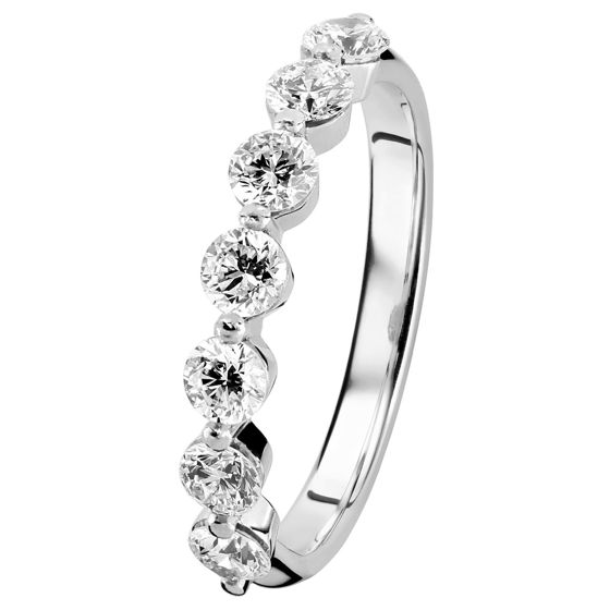 Kotimainen Kohinoor Dahlia valkokultainen rivitimanttisormus. Tässä valkokultaisessa timanttisormuksessa ihastuttaa kaunis timanttirivistö, josta löytyvät seitsemän kappaletta 0,13 ct painoisia timantteja. Timanttien yhteispaino on 0,91 ct. Rivisormus on valmistettu 14 karaatin valkokullasta ja sen rungon leveys on noin 2,4 mm.