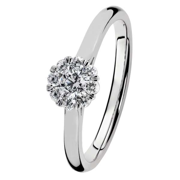 Kotimainen Kohinoor Dahlia valkokultainen halo-timanttisormus. Tässä valkokultaisessa timanttisormuksessa ihastuttavat kukkamaisessa muodostelmassa säkenöivät timantit. Keskikivi on painoltaan 0,14 ct ja sitä kehystävät kahdeksan kappaletta 0,02 ct painoista timanttia. Timanttien yhteispaino on 0,30 ct. Halosormus on valmistettu 14 karaatin valkokullasta ja sen rungon leveys on 1,9 mm.