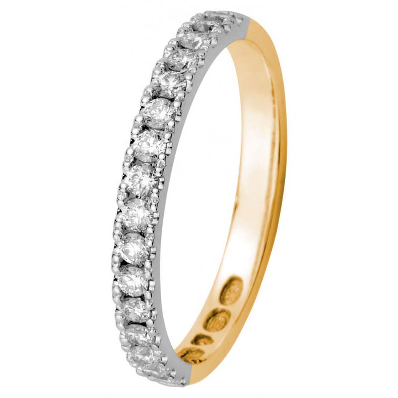 Kotimainen Kohinoor Estelle keltakultainen timanttisormus, joka on puoliallianssi eli timantit peittävät rungosta puolet. Tässä kultaisessa timanttisormuksessa istutus on valkokultaa ja siihen on istutettu 16 kappaletta säihkyvää timanttia, jotka ovat yhteispainoltaan 0,32 ct. Estelle-timanttisormus on rivisormus, joka on kaunis yksinään sekä täydellinen yhdistelmä esimerkiksi sivukivellisen timanttisormuksen kanssa. Timanttisormuksen runko on valmistettu 14 karaatin keltakullasta, ja istutusosa 14 karaatin valkokullasta. Tutustu myös muihin Estelle-malliston sormuksiin!