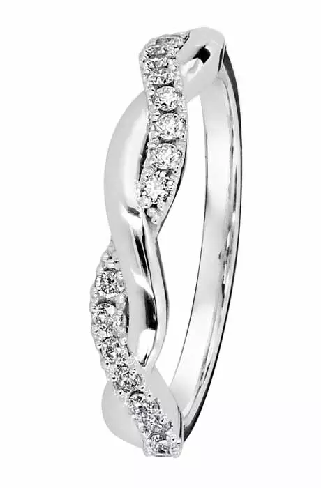 Klassisen Kohinoor Estelle-malliston elegantti sormus, jossa timanttirivi kietoutuu köynnöksen lailla yhteen kiiltävän valkokullan kanssa. Tämän Estelle timanttisormuksen runkoa koristavat 17 kappaletta 0,01 ct painoisia timantteja. Sormuksen leveys on edestä 3,7 mm ja takaa rungon leveys on 1,8 mm. Sormus on valmistettu laadukkaasta 14 karaatin valkokullasta.