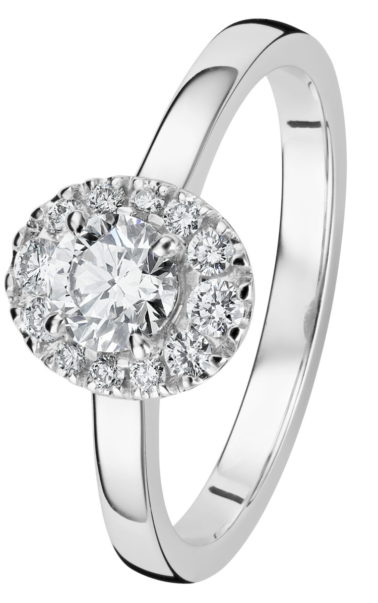 Kotimainen Kohinoor Olivia halo-sormus. Tässä valkokultaisessa halo-sormuksessa timantit on istutettu 0,34 ct keskikiven ympärille ovaaliin muotoon. Timanttisormuksen keskikiveä kehystävät 12 kappaletta timantteja, joista keskikiven ylä-ja alapuolella olevat timantit ovat suurempia kuin muut kehyskivet, luoden timanttisormukselle persoonallisen ja tyylikkään ilmeen. Timanttisormuksen timanttien yhteispaino on 0,54 ct. Timanttisormus on valmistettu 14 karaatin valkokullasta ja sen rungon leveys on 2,0 mm. Sormukseen on helppo yhdistää kihla- tai rivisormus, sillä se istuu saumattomasti toisen sormuksen rinnalle.