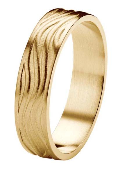 Keltakultainen miesten kihlasormus. Tämä Rytmi Aalto sormus on valmistettu 14 karaatin keltakullasta ja siinä on aaltoileva pintakuviointi. Sormuksen rungon profiili on flakka ja sormuksen rungon leveys on 5,0 mm. Sormuksen rungon leveyden vuoksi on suositeltavaa valita normaalia sormuskokoaan puoli numeroa suurempi koko, jotta voidaan taata sopiva istuvuus. Tämä sormus sopii hyvin henkilölle, joka pitää yksinkertaisista, mutta kuvioiduista sormuksista. Tästä sormuksesta on saatavilla myös valkokultainen versio.