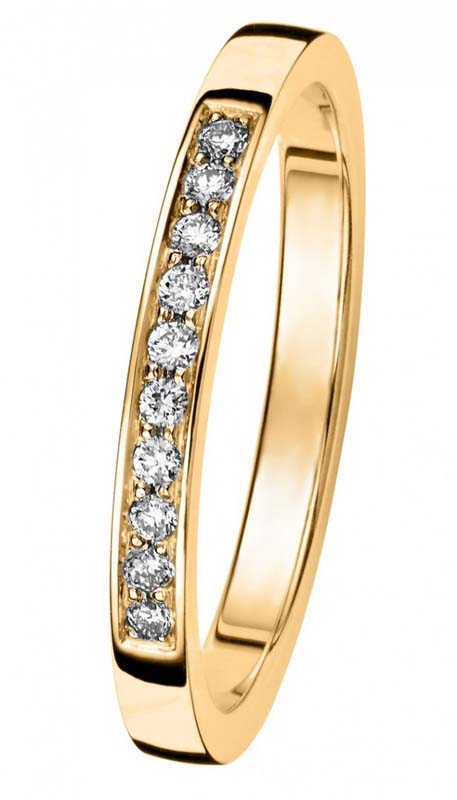 Kotimainen Kohinoor Stella keltakultainen rivitimanttisormus. Tässä kultaisessa rivisormuksessa timantit on istutettu säkenöivään riviin. Timanttisormuksen runkoa koristavat 10 kappaletta timantteja. Yhden timantin paino on 0,01 ct, joten yhteensä sormuksessa on timantteja 0,10 ct painossa. Rivisormuksen rungon leveys on 2,2 mm. Timanttisormus on valmistettu 14 karaatin keltakullasta. Tämä malli on saatavilla myös valkokultaisena ja punakultaisena. Tutustu myös muihin Stella-malliston sormuksiin!