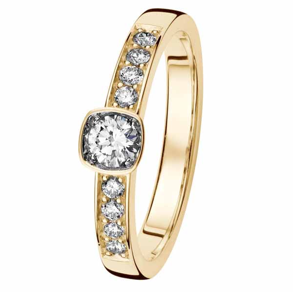 Kotimainen Kohinoor Stella sivukivellinen timanttisormus. Tässä keltakultaisessa timanttisormuksessa 0,19 ct painoista keskikiveä koristavat molemmin puolin 4 kappaletta sivukiviä, yhteispainossa 0,16 ct. Keskikiven ja sivukivien yhteispaino on 0,35 ct. Timanttisormus on valmistettu 14 karaatin keltakullasta. Keltakultaisen rungon leveys on 2,8 mm. Tämä malli on saatavilla myös valkokultaisena, Kohinoor Stella timanttisormus 033-240V-35. Tutustu myös muihin Stella-malliston sormuksiin!