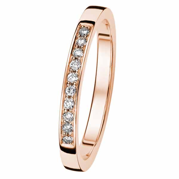 Kotimainen Kohinoor Stella punakultainen rivitimanttisormus. Tässä ruusukultaisessa rivisormuksessa timantit on istutettu säkenöivään riviin. Timanttisormuksen runkoa koristavat 10 kappaletta timantteja. Yhden timantin paino on 0,01 ct, joten yhteensä sormuksessa on timantteja 0,10 ct painosta. Rivisormuksen rungon leveys on 2,2 mm. Timanttisormus on valmistettu 14 karaatin punakullasta. Tämä malli on saatavilla myös valkokultaisena ja keltakultaisena. Tutustu myös muihin Stella-malliston sormuksiin!