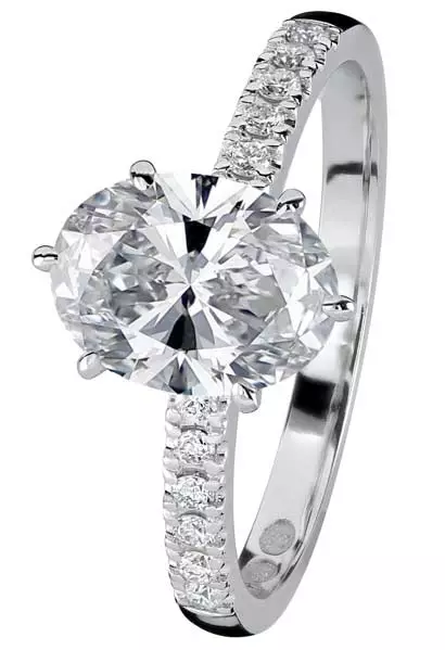 Kohinoorin Theia-solitairesormus ovaalilla timantilla ja rungon sivukivillä. Kahden karaatin ovaalia laboratoriotimanttia reunustavat 12 kappaletta 0,01 ct painoisia laboratoriotimantteja. Timanttien yhteispaino on 2,12 ct. Sormuksen runko on valmistettu 14 karaatin valkokullasta.
