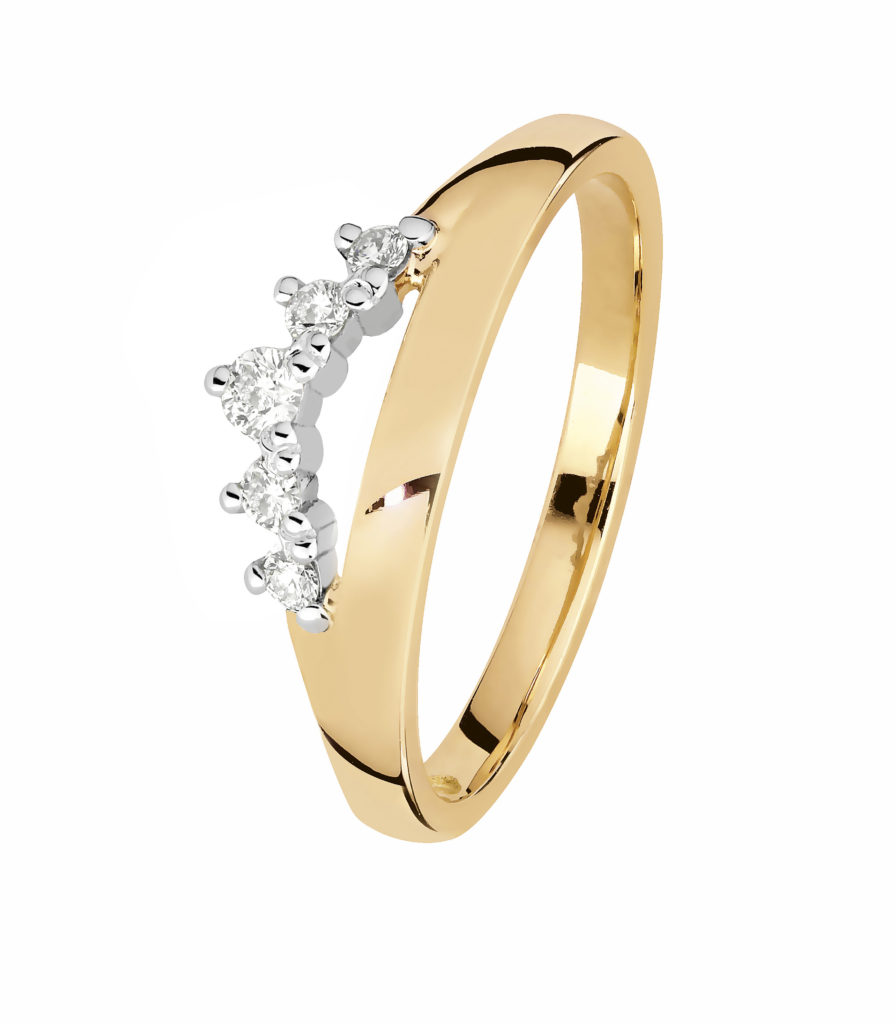 Päiväsi kuningattarena! Keltakultaisen Kohinoor Tia-sormuksen muoto muistuttaa tiaraa ja se on kaunis niin yksin kuin toisen sormuksen kanssa. Sormukseen on istutettu 5 erikokoista timanttia kruunumaiseen muotoon, jotka pienenevät sivuille päin. Kivien yhteispaino on 0,13 ct. Timanttisormus on valmistettu 14 karaatin keltakullasta ja kruunuosuus on valkokultaa. Sormuksen siron rungon leveys on 2,0 mm. Sormus on satavilla myös valkokultaisena!