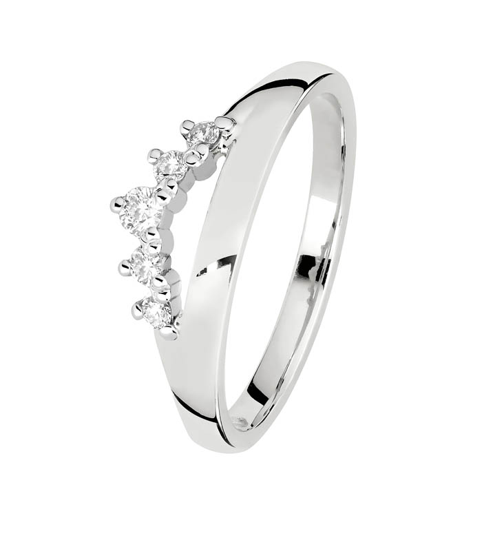Päiväsi kuningattarena! Valkokultaisen Kohinoor Tia-sormuksen muoto muistuttaa tiaraa ja se on kaunis niin yksin kuin toisen sormuksen kanssa. Sormukseen on istutettu 5 erikokoista timanttia kruunumaiseen muotoon, jotka pienenevät sivuille päin. Kivien yhteispaino on 0,13 ct. Timanttisormus on valmistettu 14 karaatin valkokullasta. Sormuksen siron rungon leveys on 2,0 mm. Sormus on satavilla myös keltakultaisena!
