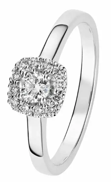 Kotimainen Kohinoor timanttisormus. Rohkea ja viettelevä Valerie on yksi rakastetuimmista Kohinoor-sormusmalleista. Sirossa 14 karaatin valkokultaisessa sormuksessa on cushionmuotoinen halo-istutus, jonka keskellä säihkyy 0,18 ct:n timantti. Kaunista timanttia ympäröi 12 kappaletta 0,01 ct timantteja, timanttien yhteispaino on siis 0,30 ct. Sormuksen pyöristetyn flakkarungon leveys on 2 mm.