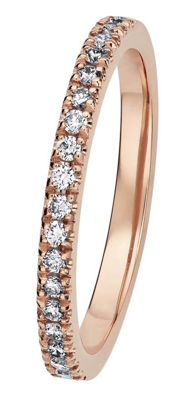 Kotimainen Kohinoor timanttisormus. Rohkea ja viettelevä Valerie on yksi rakastetuimmista Kohinoor-sormusmalleista. Sirossa 14 karaatin ruusukultaisessa rivitimanttisormuksessa on istutettu 18 kappaletta 0,01 ct:n timanttia säihkyvään riviin. Tätä mallia kutsutaan puoliallianssiksi, koska kivet peittävät puolet sormuksen pinta-alasta. Timanttien yhteispaino on 0,18 ct. Sormuksen pyöristetyn flakkarungon leveys on 2,1 mm. Tämä sormus on helppo yhdistää erilaisten kihla- ja vihkisormusten kanssa. Saatavana myös kelta- sekä valkokultaisena!