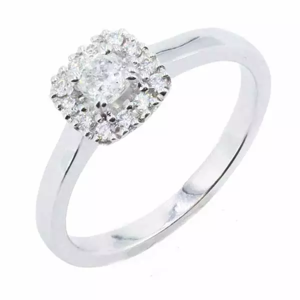 Kotimainen Kohinoor Valerie valkokultainen halo-sormus timanteilla. Tässä valkokultaisessa timanttisormuksessa ihastuttaa kaunis halokoriste, jossa 0,23 ct painoista keskitimanttia kehystävät 12 kappaletta 0,01 ct painoisia timantteja. Timanttien yhteispaino on 0,35 ct. Halosormus on valmistettu 14 karaatin valkokullasta ja sen rungon leveys on noin 2,2 mm. Sormuksen koko on 16,5 mm.