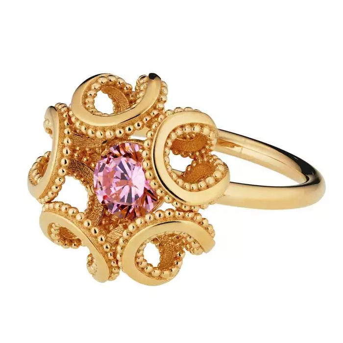 Kotimainen Lumoava Alma -sormus kullatusta hopeasta. Sormuksen herkkä, pitsimäinen muotoilu on saanut inspiraationsa viktoriaanisen ajan estetiikasta. Kokonaisuuden kruunaa kauniisti säihkyvä vaaleanpunainen zirkonia. Sormuksen koruosan koko on 17 x 18 mm. Kullattu 925 sterling-hopea on laadukas ja kestävä materiaali.