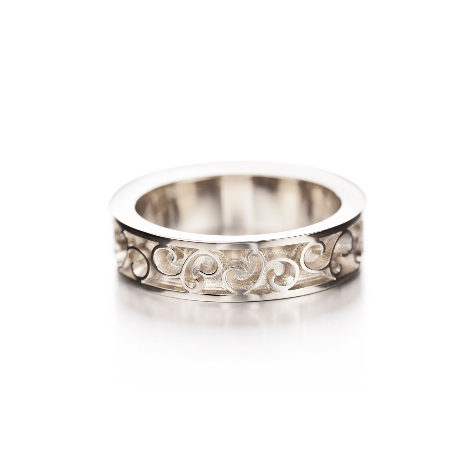 Kotimanen naisten kihla- ja vihkisormus. Kevyt ja koristeellinen Kiara kultasormus lumoaa kauneudellaan. Valmistusmateriaali on laadukas 14 karaatin valkokulta. Kultasormuksen leveys on 5 mm ja sitä on saatavilla koosta 15,0 kokoon 19,0. Tämän sormuksen leveän rungon vuoksi on suositeltavaa valita normaalia sormuskokoaan noin puoli numeroa suurempi koko, jotta voidaan taata sormuksen sopiva istuvuus.