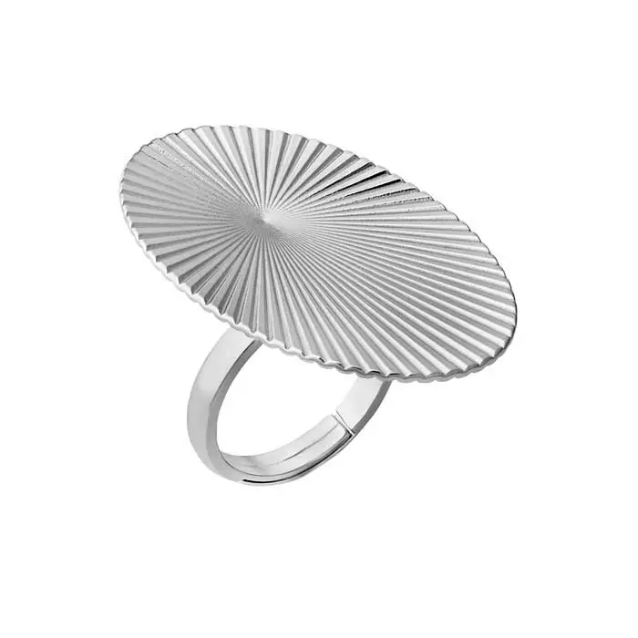 Tämä Ritva-Liisa Pohjalaisen Sisin-sarjan näyttävä sormus on todellinen katseenvangitsija. Sen suuri, noin 25 x 38 mm kokoinen koruosa toistaa sarjalle ominaista selkeää ja veistoksellista muotokieltä, joka on saanut inspiraationsa sisäisestä voimasta. Sormus on valmistettu laadukkaasta platinoidusta 925 sterling-hopeasta, jonka kirkas ja hohtava pinta korostaa korun näyttävää muotoa. Sormuksessa on säädettävä runko, ja siitä on saatavilla kolme eri kokovaihtoehtoa: 15,5–17,5 mm, 17,5–19 mm ja 19,5–21,5 mm.