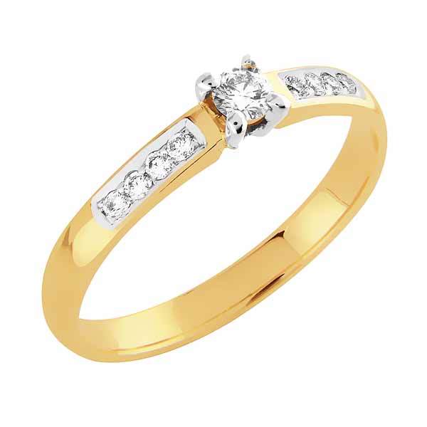 18 tai 14 karaatin keltakullasta valmistettu timanttisormus. Tämän keltakultaisen sormuksen tasaleveän rungon leveys on noin 2,4 mm ja rungon profiili on tynnyri. Sormuksen keskipisteenä säihkyy 0,09 ct timantti. Sormuksessa säihkyy yhteensä 9 timanttia, joiden yhteispaino on 0,17 ct.