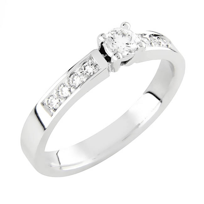 18 karaatin valkokullasta valmistettu timanttisormus. Tämän valkokultaisen sormuksen tasaleveän rungon leveys on noin 3 mm ja rungon profiili on flakka. Sormuksessa säihkyy yhteensä 9 timanttia, joiden yhteispaino on 0,30 ct. Sivukivisormukset ovat suosittuja vihkisormuksia ja ne sopivat kauniisti esimerkiksi rivisormuksen vierelle.