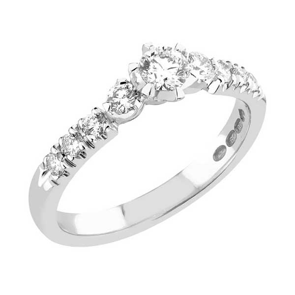 Upea timanttisormus keskikivellä ja kauniilla timanttirivistöllä sivukiviä. Valmistusmateriaali laadukas 18 karaatin palladiumvalkokulta. Rungon leveys 2,6 mm. Klassisen mallinen keskikivellinen sormus yhteensä 0,53 ct painolla kiviä, jossa keskikiven viereiset sivukivet ovat muuta sivutimanttirivistöä suurempia.