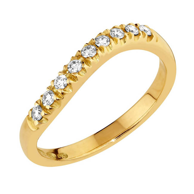 14 karaatin keltakullasta valmistettu "mutka" rivitimanttisormus. Sormuksen rungon leveys on noin 2,3 mm. Sormukseen on istutettu 9 kappaletta säihkyvää timanttia, jotka ovat yhteispainoltaan 0,15 ct. T-165k rivisormus on yhteensopiva Joenmutka-malliston rivisormuksien vierelle.