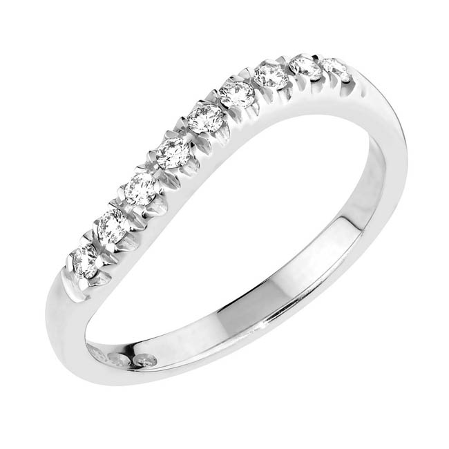 14 karaatin valkokullasta valmistettu "mutka" rivitimanttisormus. Sormuksen rungon leveys on noin 2,3 mm. Sormukseen on istutettu 9 kappaletta säihkyvää timanttia, jotka ovat yhteispainoltaan 0,15 ct. T-165w rivisormus on yhteensopiva Joenmutka-malliston rivisormuksien vierelle.