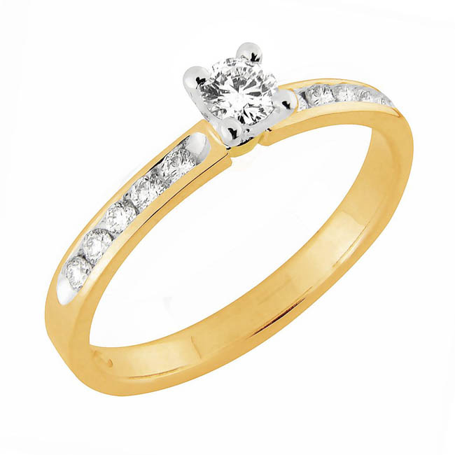 18 karaatin keltakullasta valmistettu klassinen timanttisormus. Sormuksen rungon leveys on noin 2 ,3 mm ja rungon profiili on flakka. Sormukseen on istutettu 11 kappaletta säihkyvää timanttia, jotka ovat yhteispainoltaan 0,34 ct. V-218 sormus on täydellisesti yhteensopiva Kassiopeia-malliston timanttisormuksien vierelle.
