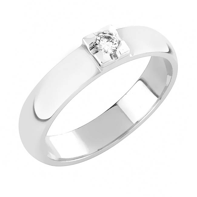 Valkokultainen timanttisormus tarjoushintaan. 14 karaatin valkokullasta valmistetun tynnyriprofiilisen rungon leveys on 4 mm. Sormuksessa on yksi timantti, jonka paino on 0,07 ct.