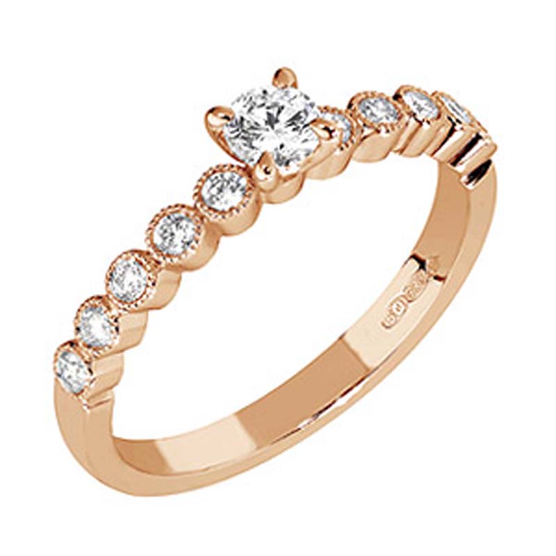 Tynnyriprofiilisessa sormuksessa on 11 timanttia. Sormus on 14k punakultaa.