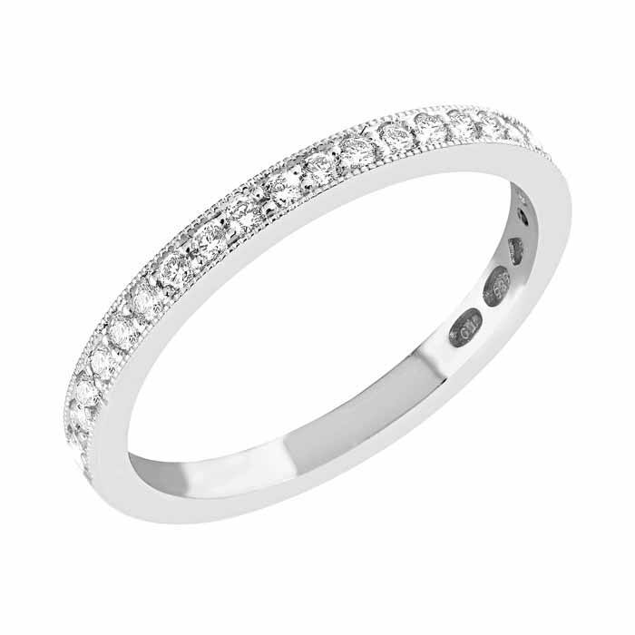 14 karaatin valkokullasta valmistettu vintage-henkinen rivitimanttisormus. Sormuksen rungon leveys on noin 1,9 mm ja flakkarungon alaosan profiili on loivasti pyöristetty. Sormukseen on istutettu 21 kappaletta säihkyvää timanttia, jotka ovat yhteispainoltaan 0,20 ct. M-650w rivisormus on täydellisesti yhteensopiva Kukkaniitty-malliston halo-sormuksien vierelle. Timanttien istutus, koko ja rivin pituus ovat sivukivellisiä halo-sormuksia vastaavat.