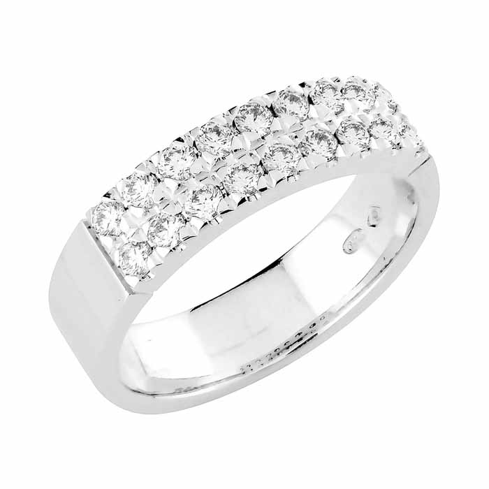 18 karaatin valkokullasta valmistettu 2-rivinen rivitimanttisormus. Sormuksen rungon leveys on noin 5 mm ja rungon profiili on flakka. Sormukseen on istutettu 18 kappaletta säihkyvää timanttia, jotka ovat yhteispainoltaan 0,50 ct. M-188w rivisormus on yhteensopiva esimerkiksi Kuunsäde-malliston solitare-sormuksien vierelle.