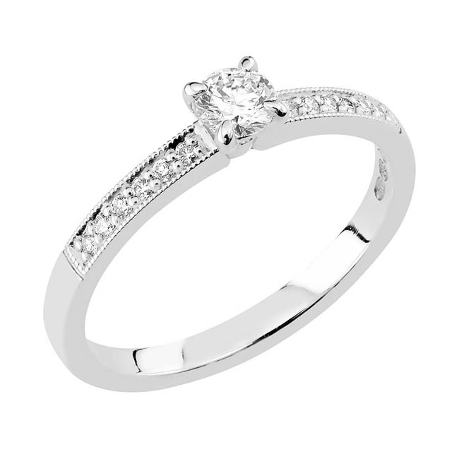 14 karaatin valkokullasta valmistettu timanttisormus. Sormuksen rungon leveys on noin 2 mm ja rungon profiili on tynnyri. Sormukseen on istutettu 13 kappaletta säihkyvää timanttia, jotka ovat yhteispainoltaan 0,26 ct. 12 sivukiveä on istutettu siroon krysanttireunaiseen istutukseen. M-140w timanttisormus on täydellisesti yhteensopiva Suvituuli-malliston rivisormuksien vierelle.