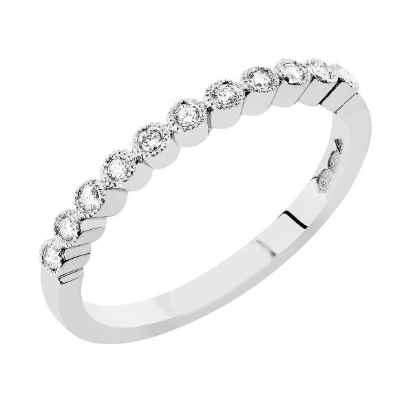14 karaatin valkokullasta valmistettu rivitimanttisormus. Sormuksen rungon leveys on noin 1,8 mm ja rungon profiili on tynnyri. Sormukseen on istutettu 11 kappaletta säihkyvää timanttia krysanttireunaiseen umpi-istutukseen, jotka ovat yhteispainoltaan 0,10 ct. M-110w rivisormus on täydellisesti yhteensopiva Suvituuli- ja Kukkaniitty-malliston sormuksien vierelle.