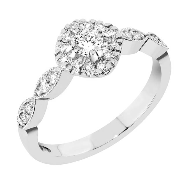14 karaatin valkokullasta valmistettu halo-timanttisormus. Sormuksen rungon leveys on noin 2,3 mm. Sormukseen on istutettu 21 kappaletta säihkyvää timanttia, jotka ovat yhteispainoltaan 0,35 ct. Sormuksen halokoriste on asetettu runkoon nähden kulmittain ja siihen on istutettu 0,15-018 ct keskivi sekä 12 kappaletta kehyskiviä. Sormuksen runkoon on istutettu 8 kappaletta sivukiviä krysanttiraunaiseen istutukseen. M-1141Bw halo-rivisormus on täydellisesti yhteensopiva Suvituuli- ja Kukkaniitty-malliston rivisormuksien vierelle.