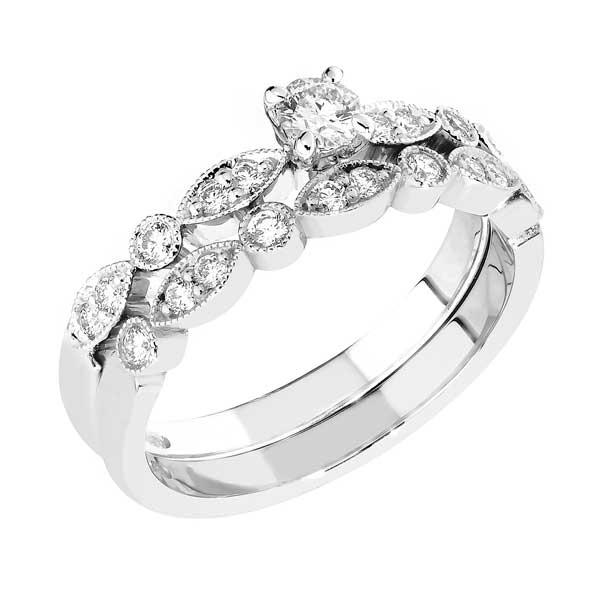14 karaatin valkokullasta valmistettu timanttisormusyhdistelmä kahdella Sandbergin Suvituuli-malliston sormuksella. Sormusyhdistelmästä löytyy romanttinen vintage-tyylinen sivukivellinen timanttisormus kaverinaan yhteensopiva rivitimanttisormus. Timanttien yhteispaino on 0,40 ct ja rungon leveys 4,4 mm. Romanttinen krysanttireunainen ja siro timanttisormusyhdistelmä hieman koristeellisempaan makuun!