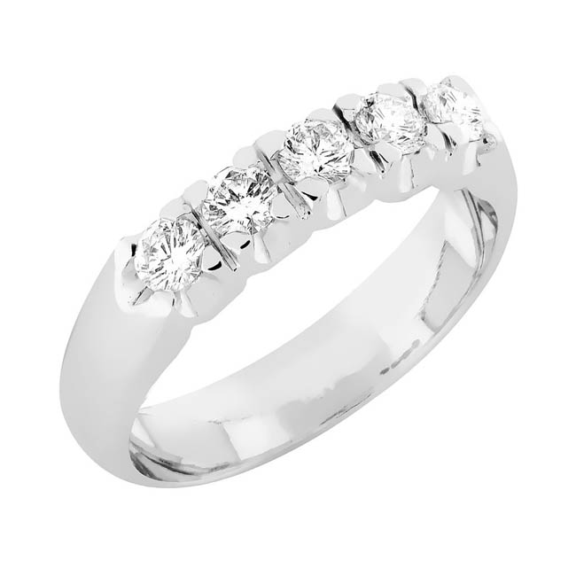 18 karaatin valkokullasta valmistettu rivitimanttisormus. Sormuksen rungon leveys on noin 4,5 mm ja rungon profiili on tynnyri. Sormukseen on istutettu 5 kappaletta säihkyvää timanttia, jotka ovat yhteispainoltaan 0,57 ct. T-9-5w rivisormus on yhteensopiva Aamukaste-malliston solitaire-sormuksien vierelle.