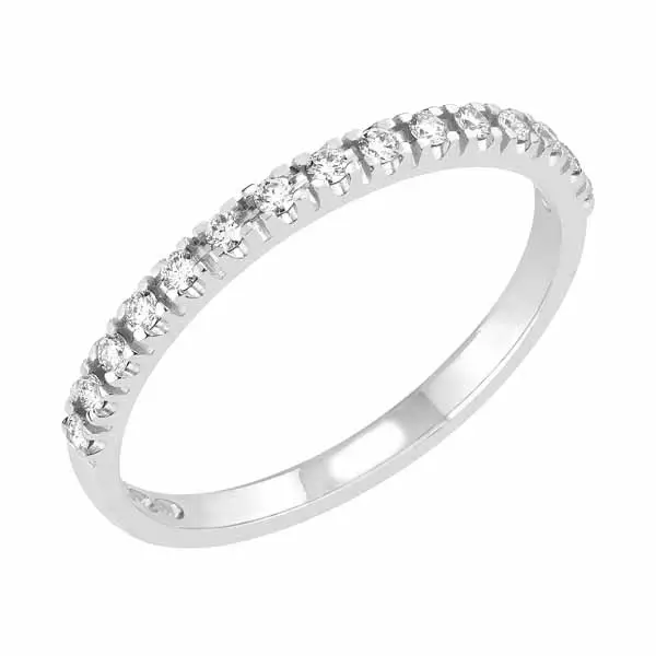 14 karaatin valkokullasta valmistettu klassinen rivitimanttisormus. Sormuksen rungon leveys on noin 1,8 mm ja rungon profiili on pyöristetty flakka. Sormukseen on istutettu 15 kappaletta säihkyvää timanttia, jotka ovat yhteispainoltaan 0,14 ct. V-701w rivisormus on täydellisesti yhteensopiva Toivomuslähde-malliston halo-sormuksien vierelle. Timanttien istutus, koko ja rivin pituus ovat sivukivellisiä halo-sormuksia vastaavat.