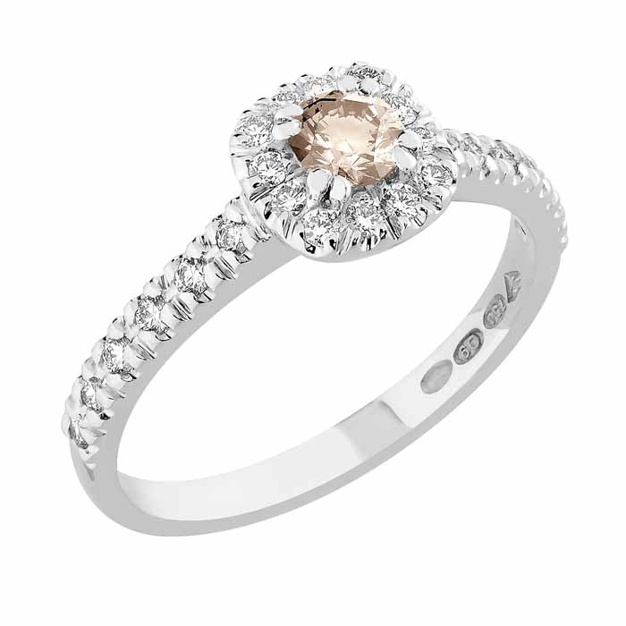 18 karaatin valkokullasta valmistettu näyttävä sormus, jossa on halo-istutus. Keskikivenä on noin 4 mm morganiitti peach, jonka ympärillä on 12 pienempää timanttia. Sormuksen runkoon on myös istutettu 12 kappaletta timantteja. Timanttien yhteispaino on 0,23 ct. Sormuksen rungon leveys on noin 2 mm ja rungon profiili on pyöristetty flakka. Keskikoristeen alla on riittävästi tilaa vierussormukselle, esimerkiksi rivisormukset V-720w ja V-760w sopivat vierelle täydellisesti.