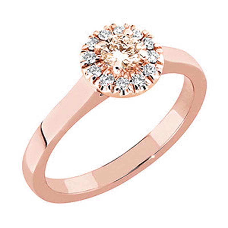 18 karaatin punakullasta valmistettu halo-timanttisormus. Sormuksen rungon leveys on noin 2 mm. Sormukseen on istutettu 12 kappaletta säihkyvää timanttia, jotka ovat yhteispainoltaan 0,10 ct. Keskelle halokoristetta on istutettu noin 4 mm morganiitti. V-718r halo-sormus on täydellisesti yhteensopiva Toivomuslähde-malliston rivisormuksien vierelle.