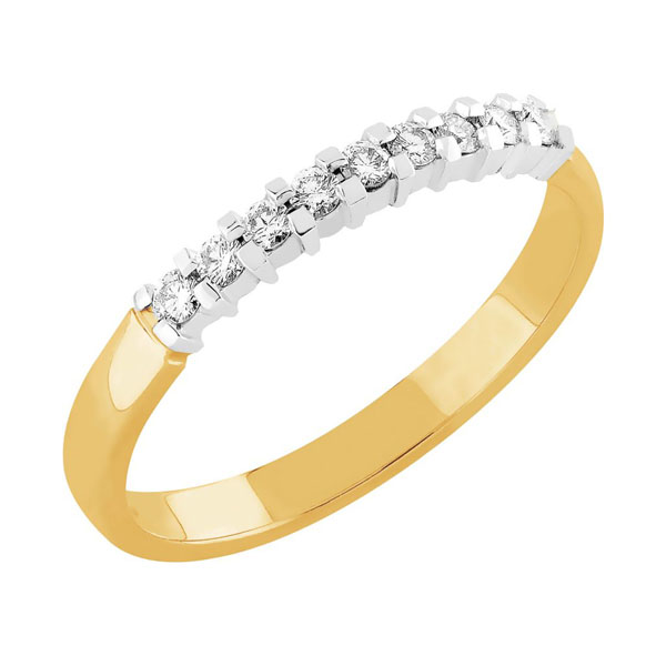 18 karaatin keltakullasta valmistettu rivitimanttisormus. Sormuksen rungon leveys on noin 2,4 mm ja rungon profiili on tynnyri. Sormukseen on istutettu 9 kappaletta säihkyvää timanttia, jotka ovat yhteispainoltaan 0,16 ct. Istutus on valkokultaa. V-19-9 rivisormus on yhteensopiva esimerkiksi Kuunsäde ja Aamukaste-malliston solitaire-sormuksien vierelle.
