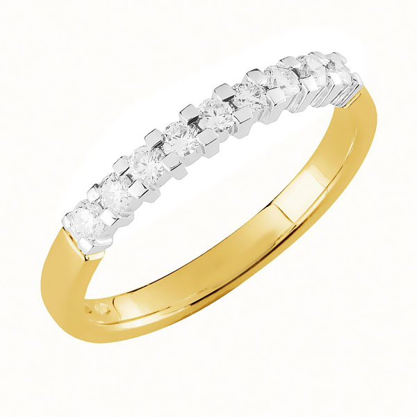 18 karaatin keltakullasta valmistettu rivitimanttisormus. Sormuksen rungon leveys on noin 2,4 mm ja rungon profiili on tynnyri. Sormukseen on istutettu 9 kappaletta säihkyvää timanttia, jotka ovat yhteispainoltaan 0,30 ct. Istutus on valkokultaa. V-29-9 rivisormus on yhteensopiva esimerkiksi Kuunsäde ja Aamukaste-malliston solitaire-sormuksien vierelle.