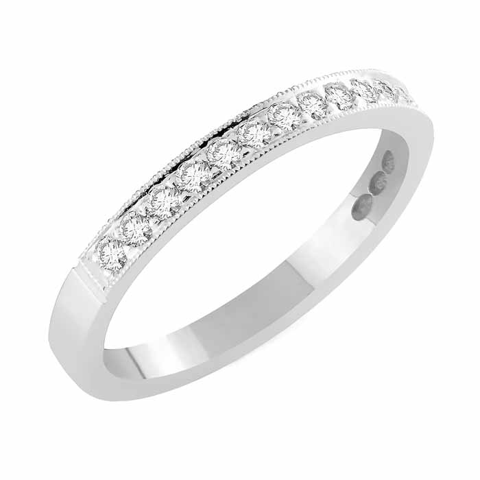 14 karaatin valkokullasta valmistettu rivitimanttisormus. Sormuksen rungon leveys on noin 2,4 mm ja rungon profiili on siro flakka. Sormukseen on istutettu 13 kappaletta säihkyvää timanttia koristeltuna krysattireunalla, jotka ovat yhteispainoltaan 0,21 ct. V-130w sormus on yhteensopiva Niittypolku- ja Kukkaniitty-malliston timanttisormuksien vierelle.