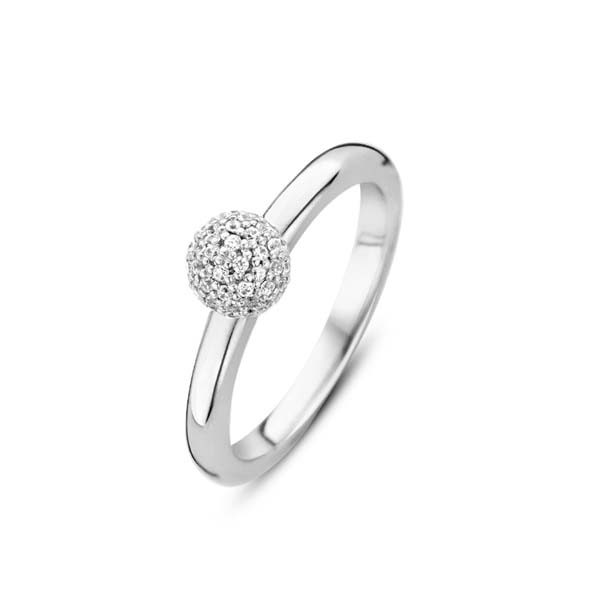 Naisten Ti Sento hopeasormus hauskalla yksityiskohdalla. Ti Senton hopeasormus on pelkistetty ja muotoilultaa minimalistinen. Sormuksen keskellä loistaa pieni pallo, jonka halkaisija on 6 mm. Palloon on istutettu kauttaaltaan kirkkaita zirkonioita. Sormuksen runko on hieman pyöristetty ja sen leveys on 2,3 mm. Materiaali on laadukas 925 sterling-hopea. Sormuksen koko on 56 mm eli se vastaa noin kokoa 18-.
