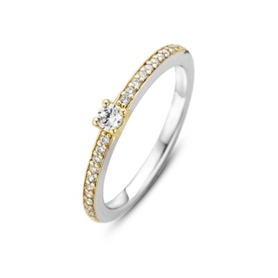 Naisten kullattu hopeasormus kirkkailla zirkonia-korukivillä. Tämä Ti Senton hopeinen sormus ihastuttaa säkenöivillä korukivillään. Rungon leveys on 1,9 mm ja suurin keskikivi on kooltaan 3 mm. Materiaali on laadukas 925 sterling-hopea. Sormuksen koko on 18,0 mm.