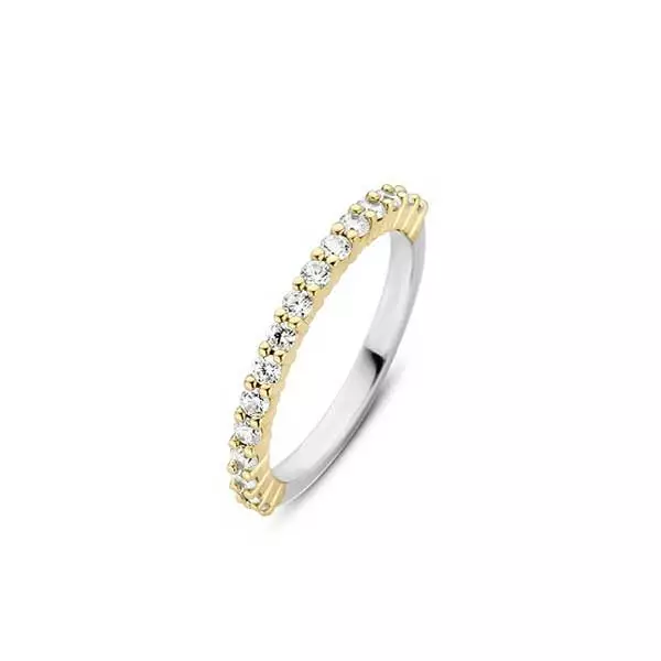 Naisten hopeasormus kirkkailla zirkonia-korukivillä. Siro ja pelkistetty säihkeentäyteinen hopeinen rivisormus kullatulla istutuksella täydentää asun kuin asun! Sormuksen materiaali on laadukas 925 sterling-hopea.