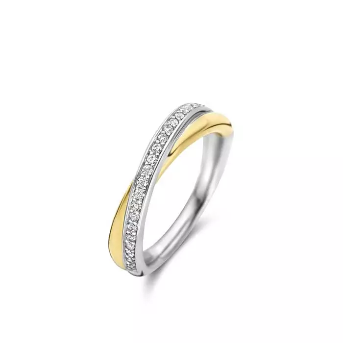 Naisten kullattu hopeasormus kirkkailla zirkonia-korukivillä. Tämä Ti Senton hopeinen sormus ihastuttaa lomittaisilla kehillään, joista toinen on koristeltu kirkkailla zirkonia-korukivillä ja toisessa on kiiltävä kullattu pinta. Runko on leveimmillään 5 mm ja ohuimmillaan takaa 2,5 mm. Materiaali on laadukas 925 sterling-hopea.