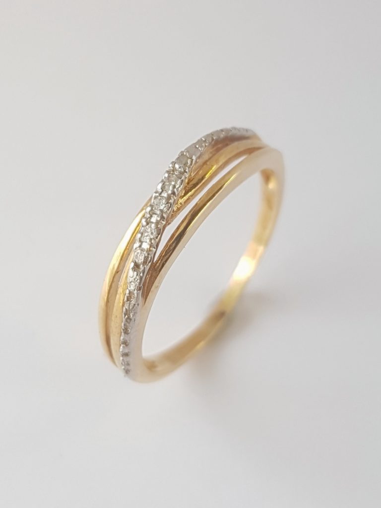 Keltakultainen timanttirivisormus, jossa on timanttirivi vinottain.